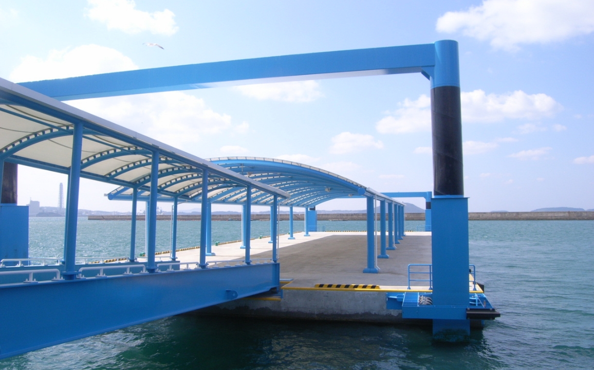 浮桟橋とは、海上・水面上に浮体を浮かべ、岸壁または護岸と連絡橋を介して接続し、フェリーや漁船などを係留する構造物です。