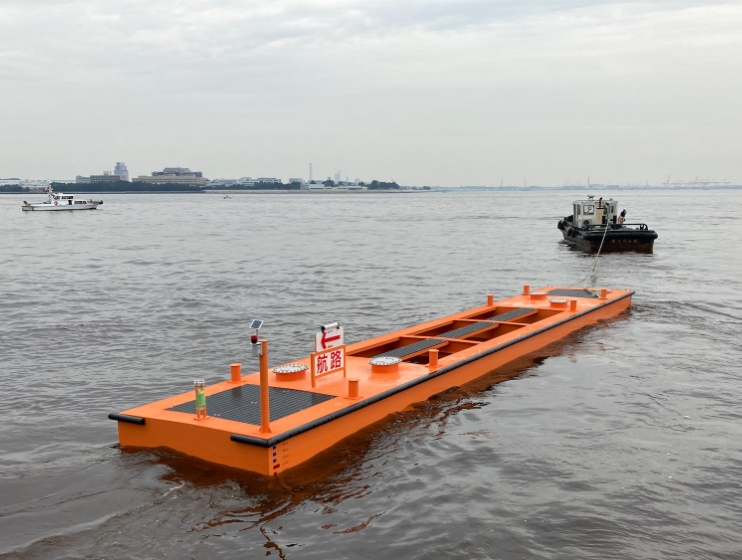 浮消波堤とは、消波機能を有する浮体により、入射する波のエネルギーを軽減(反射、攪乱、吸収)させて、漁場や港湾内の静穏化を図るための構造物です。