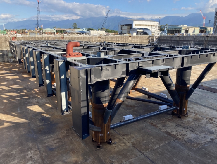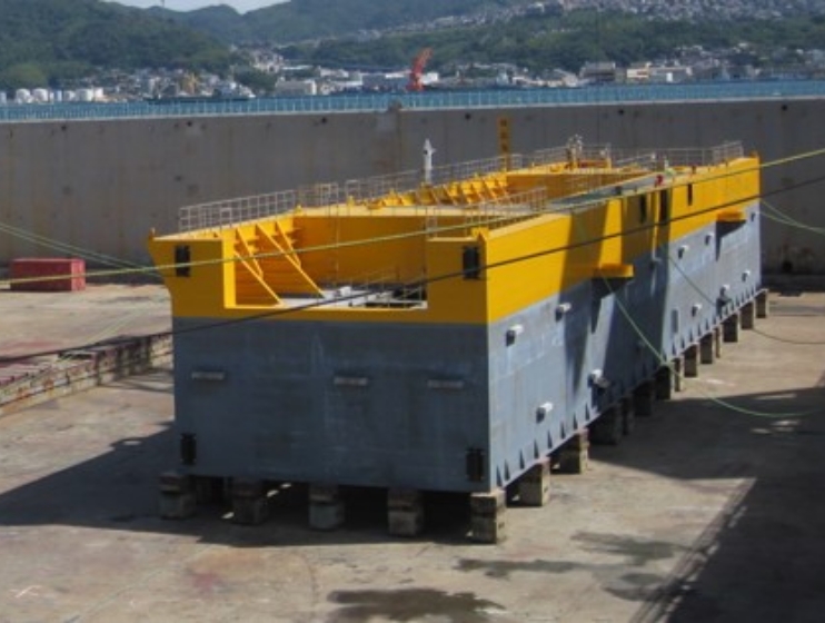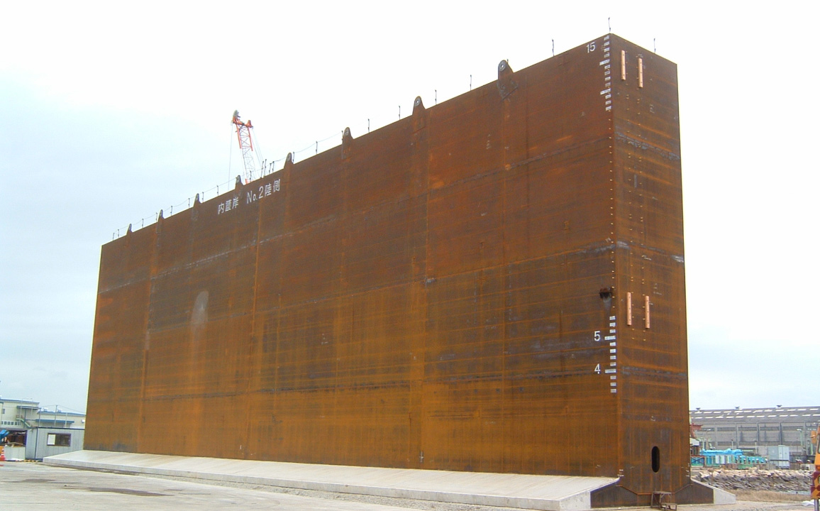 ケーソンとは、岸壁、護岸、防波堤等の大型の箱体構造物です。当社では、ハイブリッドケーソン、鋼製ケーソンの製作を行っています。
