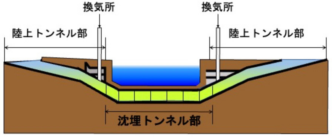 沈埋トンネルは、ドック等で製作した鋼殻およびコンクリート構造の沈埋函を海底に掘った溝(トレンチ)に沈めて接続し、土を被せた海底トンネルです。
