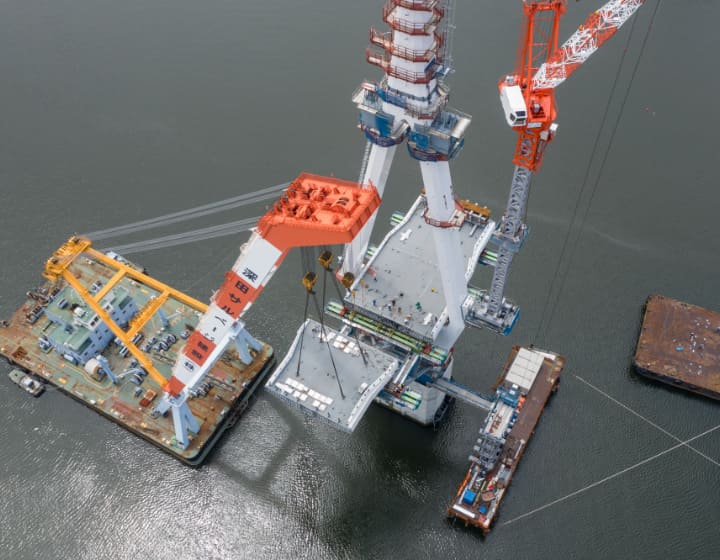 ほとんどの架設が海上であることから、特殊な建設機械や設備を多く使用しています。3000tの重量を吊るすことが可能な起重機船「富士」や、100mを超える高さを持つタワークレーン、ケーブルを設置するための装置等を駆使し、ミリ単位の精度で施工を進めました。海上かつ、高所での作業でもあることから、安全にも細心の注意を払っています。