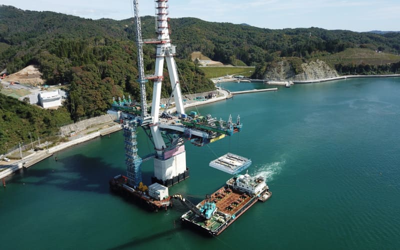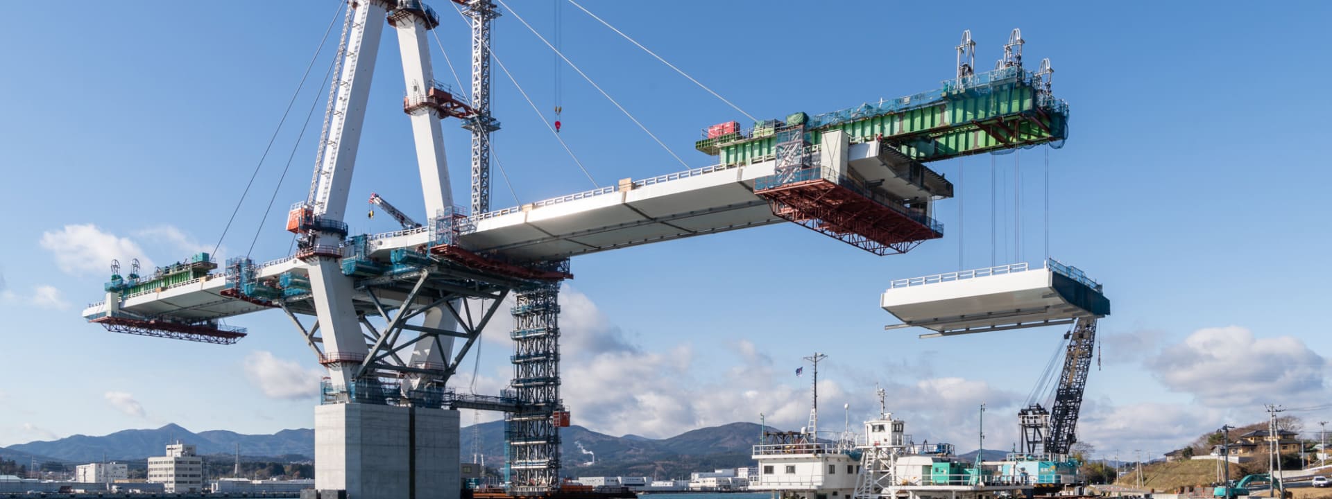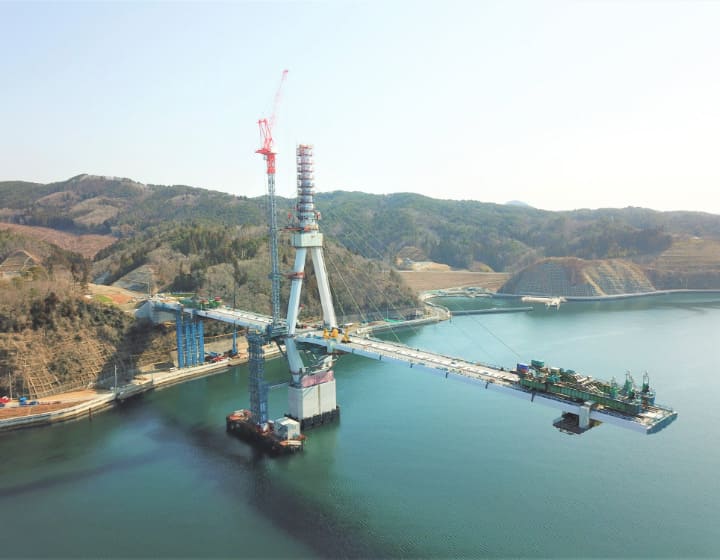 本事業は、三陸沿岸道路の一部を構成する気仙沼湾横断橋の建設作業です。三陸沿岸道路の総延長359㎞の中で、唯一海上を横断する区間となります。気仙沼湾横断橋は橋長680mの鋼3径間連続斜張橋であり、主塔は海面からの高さ115m、主塔と主塔の間(支間長)は360mの長さを持っており、東北地方で最大の鋼斜張橋であり、日本国内でも14番目の長さを誇ります。