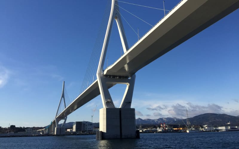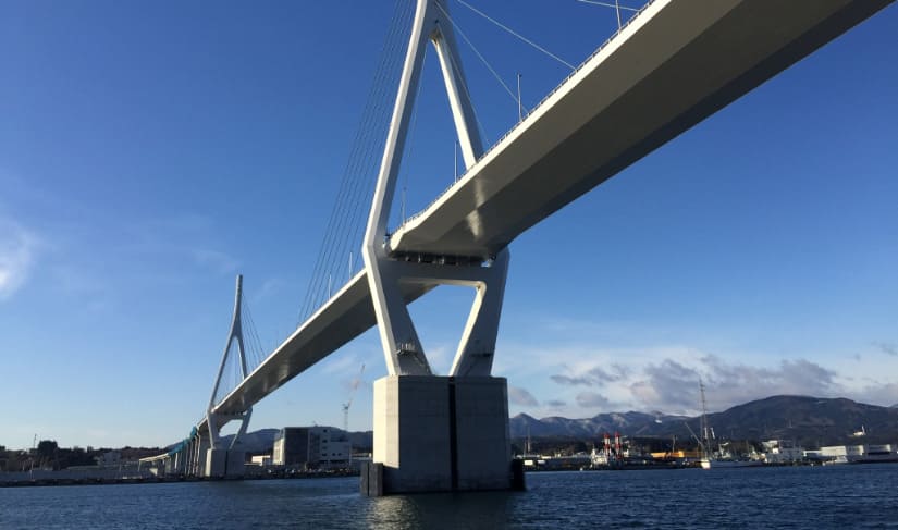 東北地方で最大帳を誇る鋼斜張橋の架橋工事です。