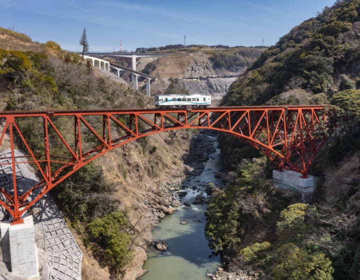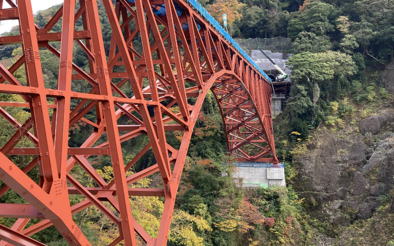 阿蘇カルデラを囲む外輪山の一角が切れ、白川が深い峡谷を形成して流れ出す場所に架橋されたアーチ橋です。南阿蘇鉄道の絶景ポイントとして、昭和2年の竣工以来親しまれてきました。構造は2ヒンジスパンドレル・ブレースト・バランストアーチとされ、国内でも数少ない橋りょう形式です。川からレール面までの高さは約60mで、完成当時、鉄道省(国鉄)で最も高さを持つ鉄道橋でした。
