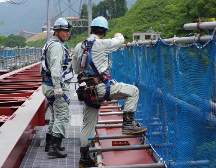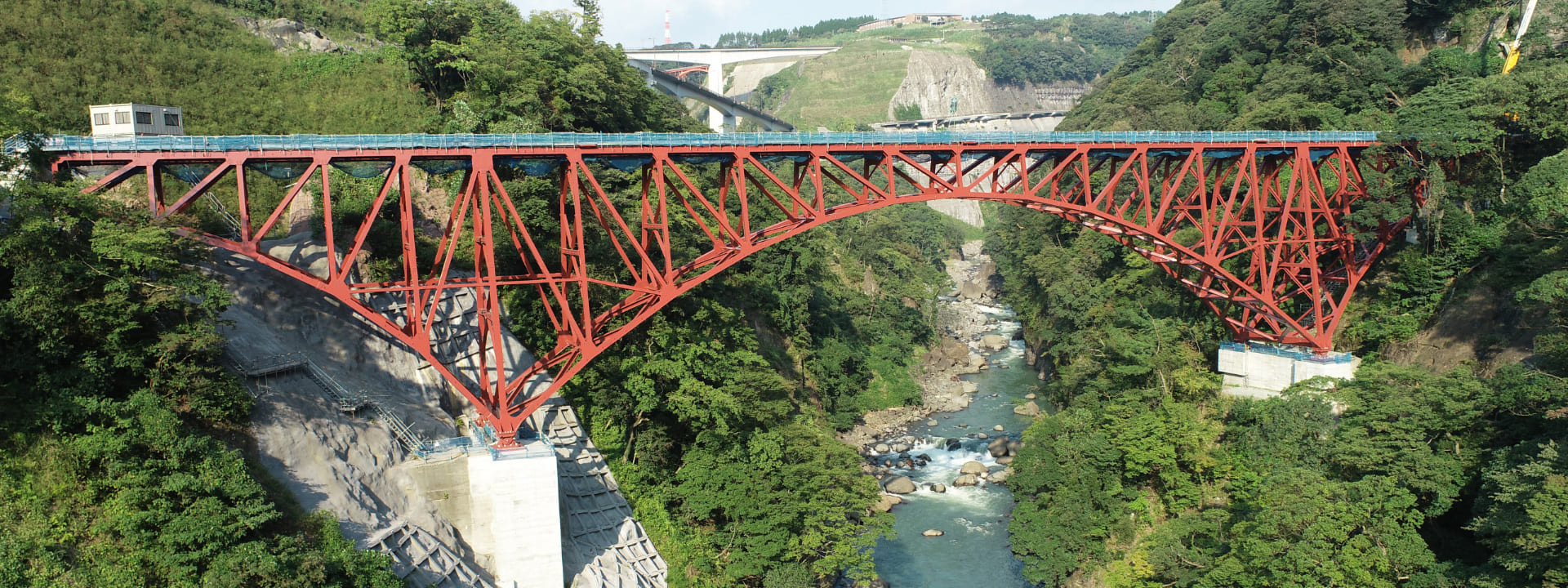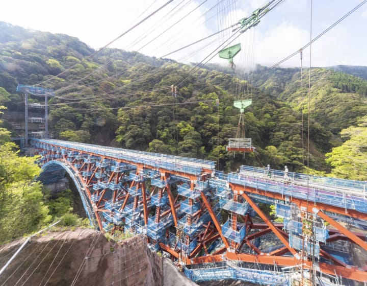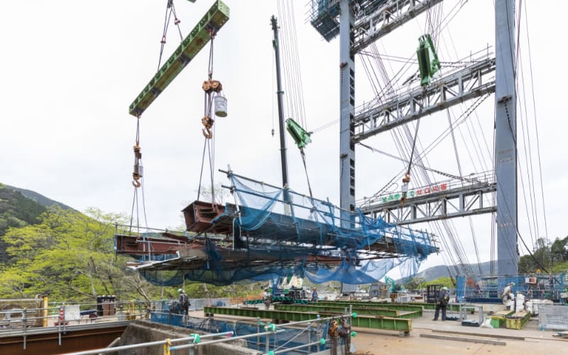 施工箇所が谷間などで作業構台の構築が不可能な場合に、橋りょうの運搬のためのケーブルクレーンと、橋りょうを支えるためのケーブルエレクション直吊設備を設置する工法です。ケーブルクレーンは、旧橋りょうを撤去・運搬した後、新しい橋りょうの架設にも継続して使用されました。工事の進捗度合により、橋の挙動が変化するため、リアルタイムでの計測・解析が必須であり、高度な技術が求められる工法です。