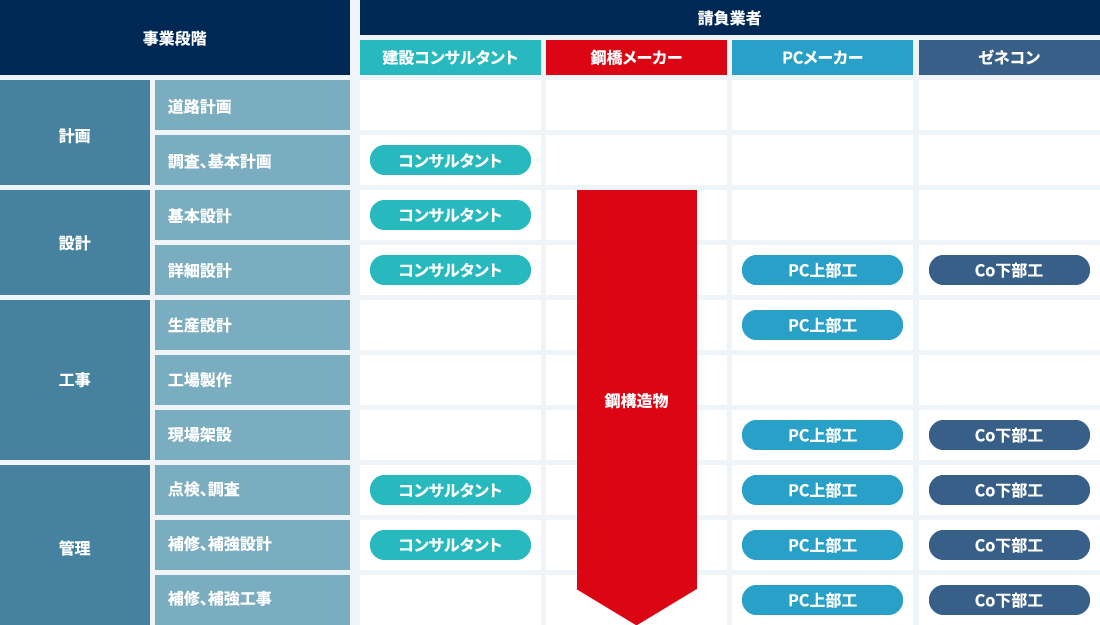 橋のコンクリート部分を工場で製造し、それを現場で組み立てる方法を提供します。PCメーカーは、プレキャストされたコンクリート部材の設計、製造、および現場での組み立てに関する専門知識を持っています。