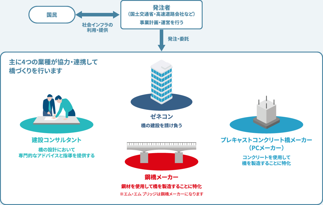 ゼネコンは橋梁事業の場合は基本的にはコンクリート橋脚の建設を担当します。構造物の現場建設に関する専門知識を持ち、プロジェクトの施工および管理を行います。ゼネコンは設計図のもとで橋を建設し、品質管理や安全管理などの業務も行います。