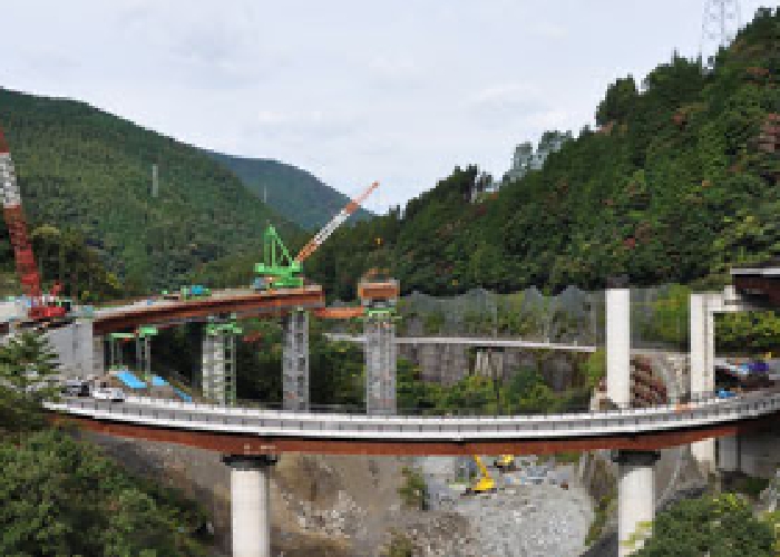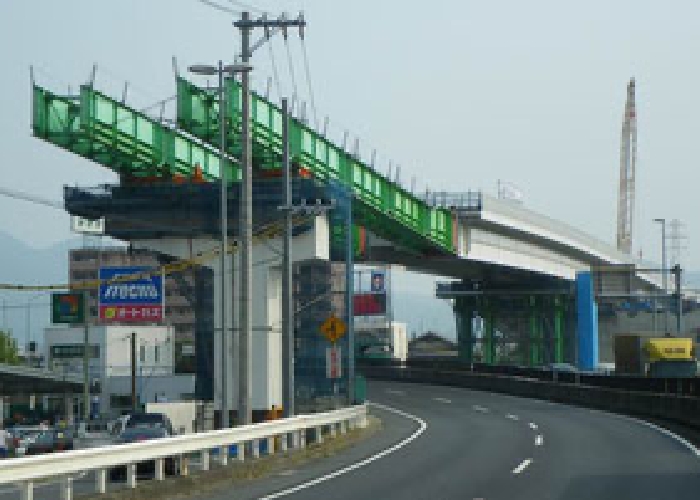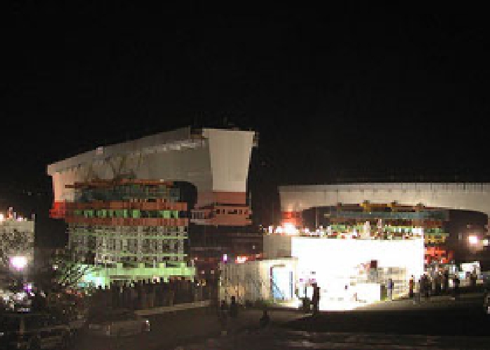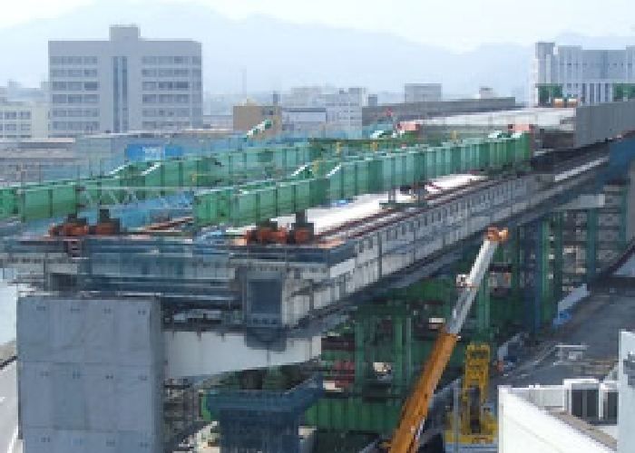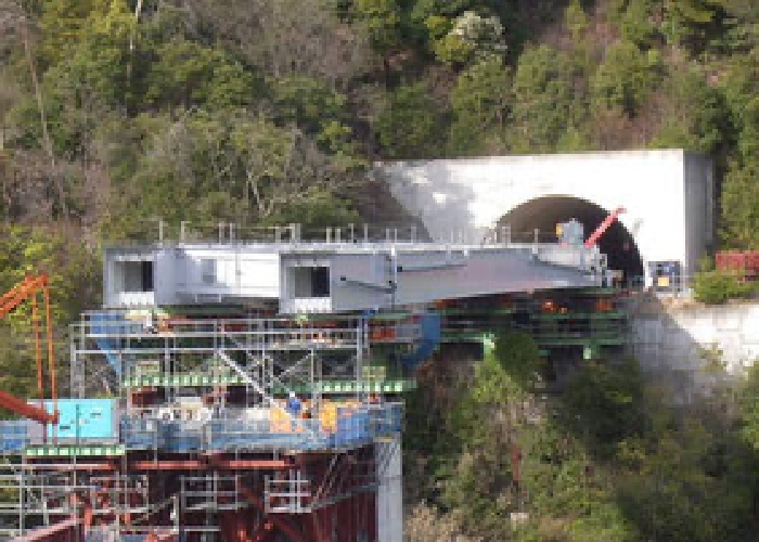 当社では、ジャッキメーカーとの永年にわたる共同開発を進めており、第二東名高速道路の有松高架橋においては、それまで1日あたり20m程度が標準とされた送り出し架設工法にて一晩に120mを超える高速送り出しに挑戦、合計1万トンにもおよぶ橋桁の送り出し架設を成功させました。