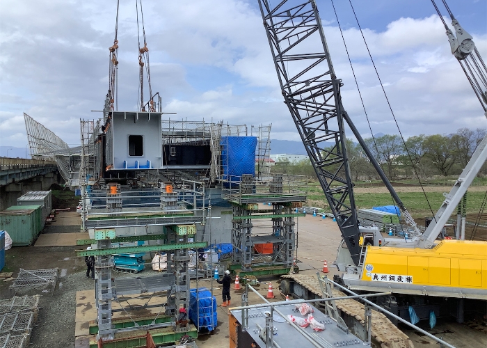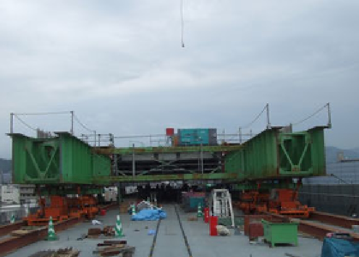 架設位置真横に設けた作業ヤードにて橋桁を組み立て、油圧ジャッキ等による推進装置を利用して橋桁を横方向に移動させて架設する工法です。