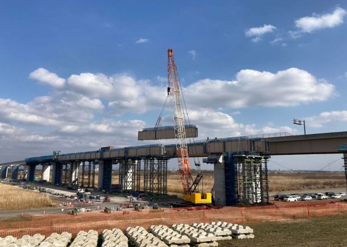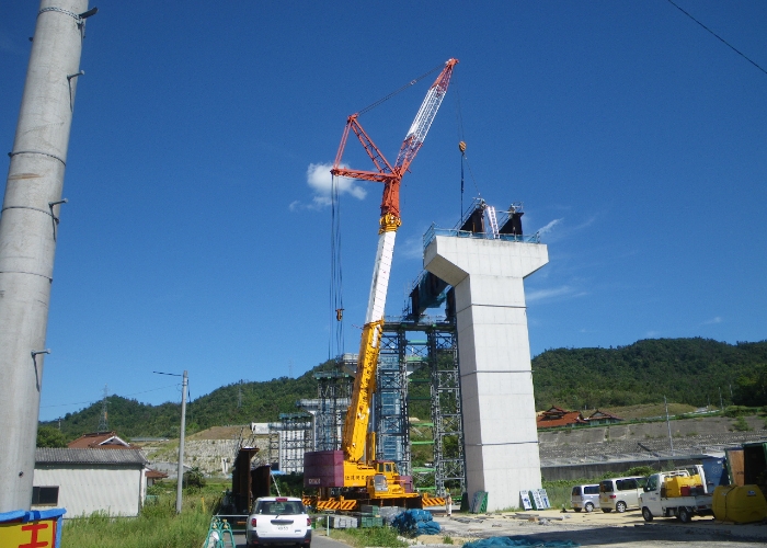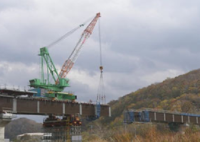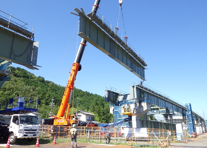 架設位置近傍で大ブロック化された橋桁ブロックを超大型のクレーン、油圧式自走台車等の特殊機械を駆使して短時間で据付完了し、道路規制等の影響を最小限度に抑えます。