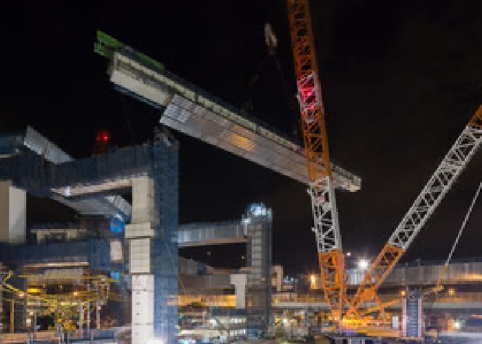 都市部の高速道路ジャンクション工事など、狭あいな作業ヤード・複雑な線形・輻輳する既設吊構造物など制約が厳しい中で周辺環境への影響を最小限にするために、度々採用されるのが一括架設工法です。