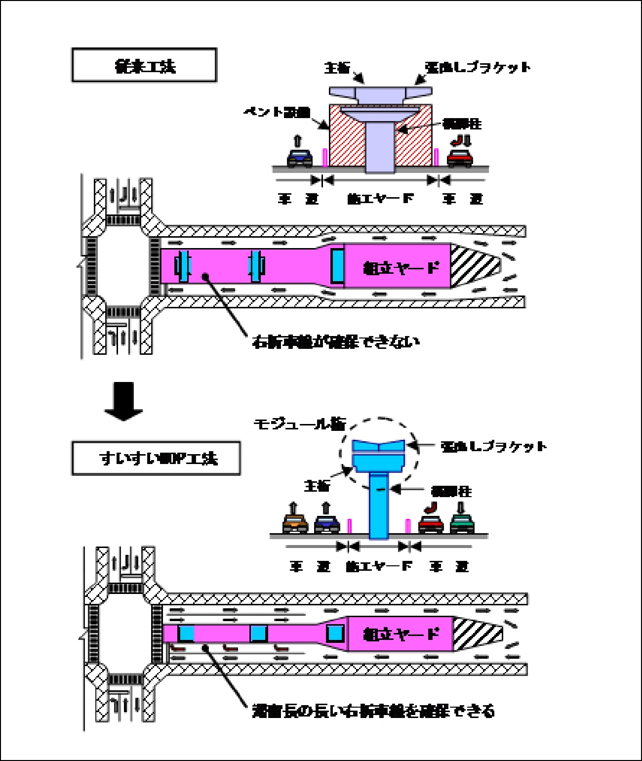 すいすいMOP⼯法は⽴体⾼架橋の急速施⼯を可能にするとともに⼯事に伴う交通渋滞を緩和することができる⼯法です。