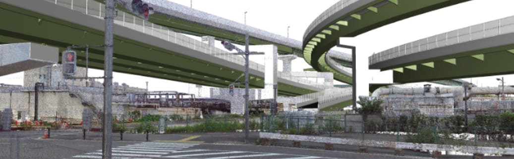 改築工事では、既設構造物との取合いが難しく、施工手順も複雑になることが多いためCIMモデルを作成し、3Dレーザースキャナー計測結果と重ね合わせて検証します。