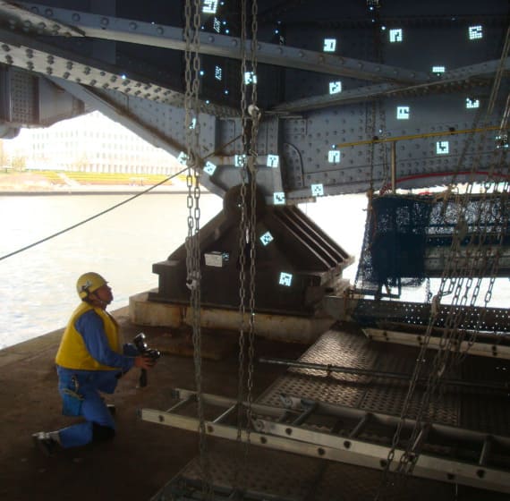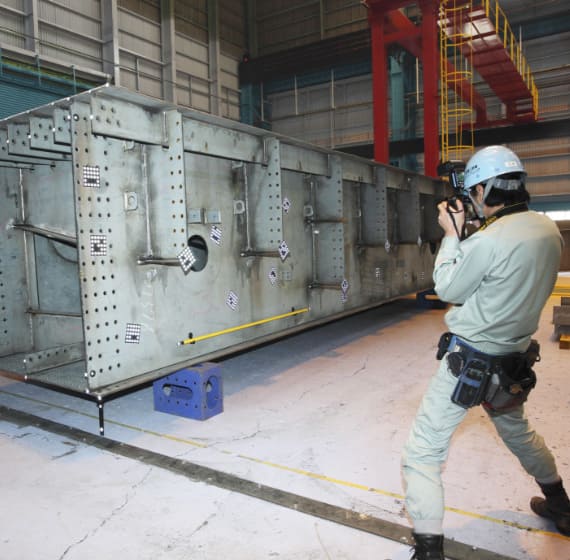 市販のデジタルカメラを用いて、計測対象に設置したターゲットを基に部材形状を3次元で高精度に計測できる技術です。ターゲットの設置とデジタルカメラでの撮影が可能であれば計測可能な技術であり、屋内・屋外問わず計測できます。工場での製作出来形確認や、補修工事での既設構造物の形状把握などで活用しています。