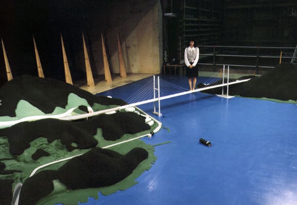 風によって橋梁がどのように挙動するかを調べるのが橋梁の風洞実験の目的です。橋梁の設計で使用する荷重のうち、風荷重は、他の荷重と異なり、一意的に推定することができません。